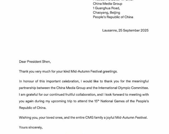 بین الاقوامی اولمپک کمیٹی کی صدر سیورین کووینٹری نے چائنا میڈیا گروپ کو ایک تہنیتی خط ارسال کیا، جس میں انہوں نے سی ایم جی کے تمام ملازمین کو وسط خزاں تہوار کی مبارکباد پیش کی۔